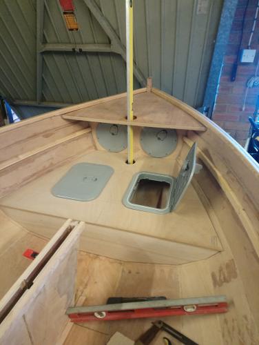 "Confessions of a Home Boat Builder in the time of Lockdown" Anyone who has been around this forum will know that a build isn't really yours until you've made a few alterations. So here is my true confession. When I started to fit out the inside of the Morbic 12 I began to think about how I would use the boat. I normally sail alone and wanted the option of being able to sleep on board. I also want to take my three granddaughters out for a sail round the harbour every now and again. ![]() After a lot of deliberation I felt the forward thwart, which would have been roughly where the upper plank is shown here at the level of the seat risers, was a bit too high for the girls, currently aged 11, 7 and 6, as I like them to be low down in the boat well protected by the bulwarks. I found I never used the forward thwart on my Coot, its not very suitable for occasional crew as they are too close to the mast and boom, and I am very unlikely to use it for rowing. I also noticed that the sloop version of the Morbic with the mast slightly further aft doesn’t have a forward thwart at all, so I thought I’d do without it. I was also aware that there was this great empty space just aft of the bulkhead where all sorts of gear was likely to accumulate. So I decided to build in a low level thwart locker. Experts will also notice I decided on two round hatches, either side of the mast rather than one single one right in front, and obscured by it. ![]() So, the locker is divided in two down the centreline. The mast steps through a box and drains into the starboard "wet" locker which in turn drains into the bilge. This side will be for anything wet and muddy, ground tackle etc. The Port Side is "Dry" well as dry as anything ever is and will be for general storage. The locker isn't watertight and doesn't form part of the internal buoyancy. I didn't want to mess with M. Vivier's calculations. The height of this locker was partly determined by the fact that I'd already cut the holes for the round hatches in the bulkhead. However the seat is low enough for the kids to lounge on safely, and will also form the forward end of my sleeping platform. The aft end of this will be made up of moveable floorboards, currently filed under "work in progress" in the section of my brain labelled "Ideas". I did a mock-up which looked a bit like this. ![]() There is actually about six and a half feet of length which should be fine for a wee bloke like me. By this time I was well into Lockdown and all but the most expensive timber merchants were closed, and I had run out of Douglas Fir. I had bought a sheet of 9mm Gaboon ply for the locker thwart from Totton Timber just before the drawbridge was raised and had plenty left so I decided to try and make a centre thwart, hinged in the middle like a Pub Bar. This should make it easier to get in and out of my bunk, and when its "open" it'll form the table top complete with fiddle to stop my coffee sliding off. The carpentry on this is a bit sketchy, Mr Chippendale (Jack) would shake his head. The starboard side will be bolted down to the centreboard case and buoyancy tank for rigidity while the port/ bunk side is held down by catches. ![]() So here she is in splendid Primer. I have actually managed to get some gloss on the inside just before I started on the Chicken Shack. I now need to steel myself and order timber for the spars and some chandlery, and chase up my sail which is locked down in Norfolk somewhere, and then there's the trailer, oh and does anyone want to buy a very nice little Heron? Take Care everyone. Beware the Second Wave. No Kidding. Graham. |